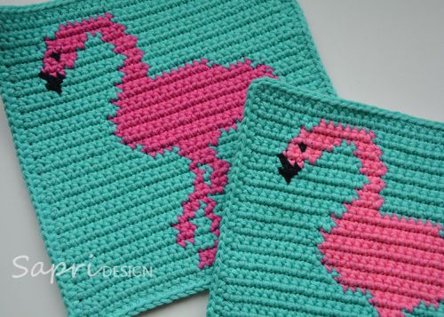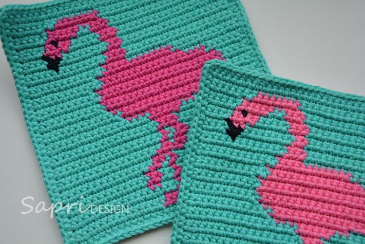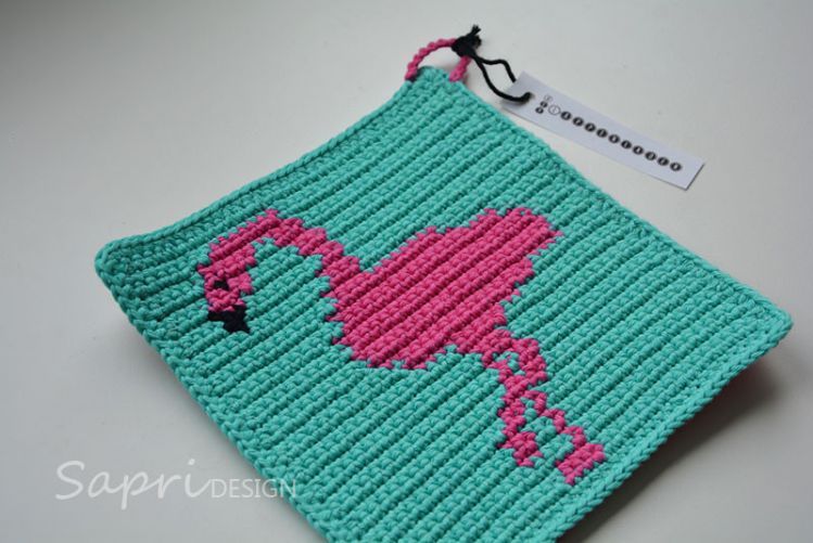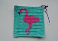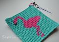 Neben der schriftlichen Anleitung für den Flamingo-Topflappen sind ein Häkelschema in Farbe und ein Häkelschema in schwarz-weiß enthalten.