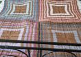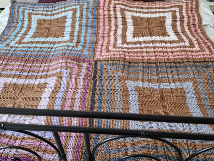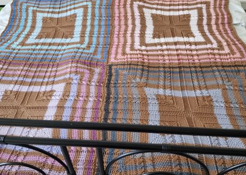 Die Decke wird in einem Mustermix gearbeitet, wobei die einzelnen Muster immer bis zum Schluss weiterlaufen, was eine ganz besondere Optik bewirkt. Ich wollte eine bunte Decke und habe für jedes Quadrat eine andere Farbkombi verwendet, wobei die Grundfarbe immer gleich ist. Wenn Du vier gleiche Bobbel verwendest, erhältst Du wieder eine ganz andere Optik, da Du dann genau siehst, wie die Muster über alle 4 Quadrate laufen und eine Einheit ergeben.