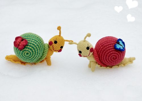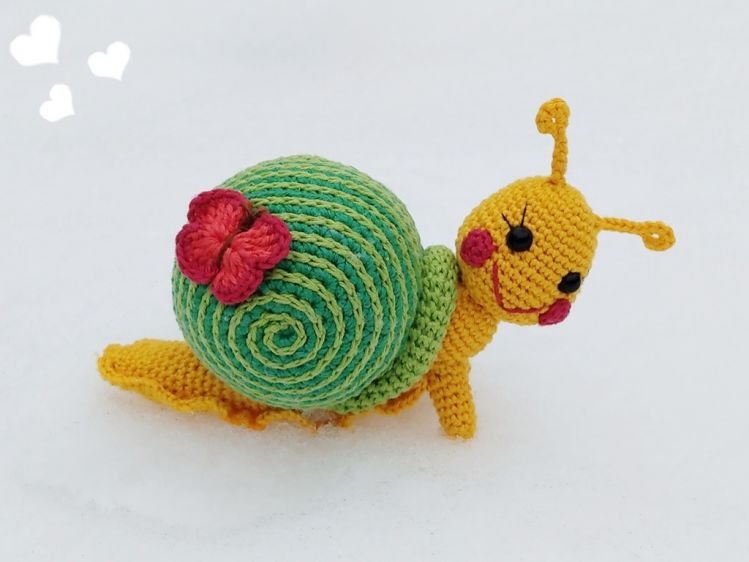 Die Schneckis werden mit angegebenem Garn ca. 16 cm lang und 11 cm hoch (mit Fühler).