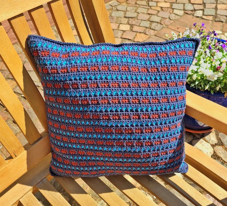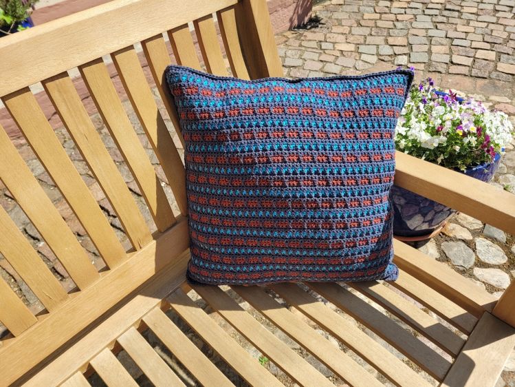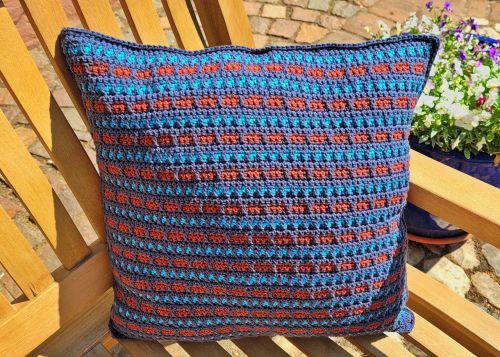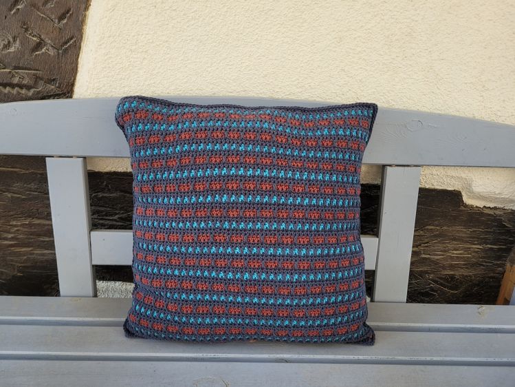 Für deine Wohnumgebung ideal, aber auch für Balkon und Terrasse. Der Kissenbezug Pablo. Das Muster gehört zu den Mosaikmustern und ist einfach gehäkelt, aber mit ganz großer Wirkung. Du brauchst Garn für die Häkelnadel 4 oder 4,5 wenn du fest häkelst. Von der Hauptfarbe benötigst du für beide Seiten zusammen ca 150 Gramm, für die Schmuckfarben je 100 Gramm. Ich habe verwendet Miro 4fach von Schoppelwolle.
