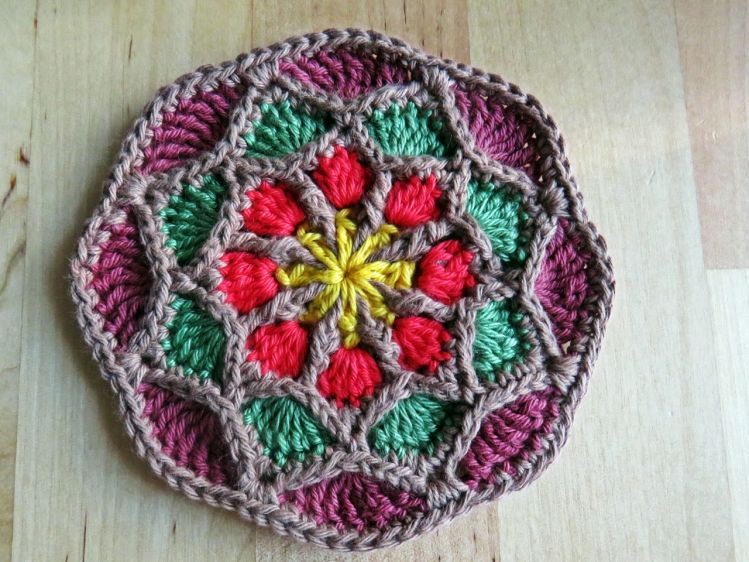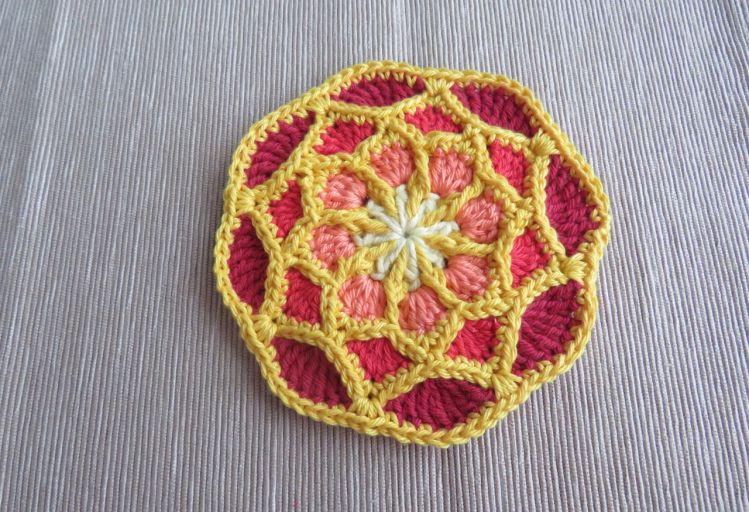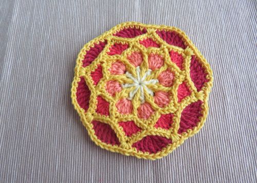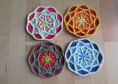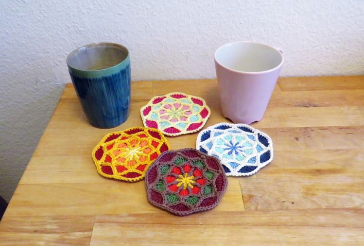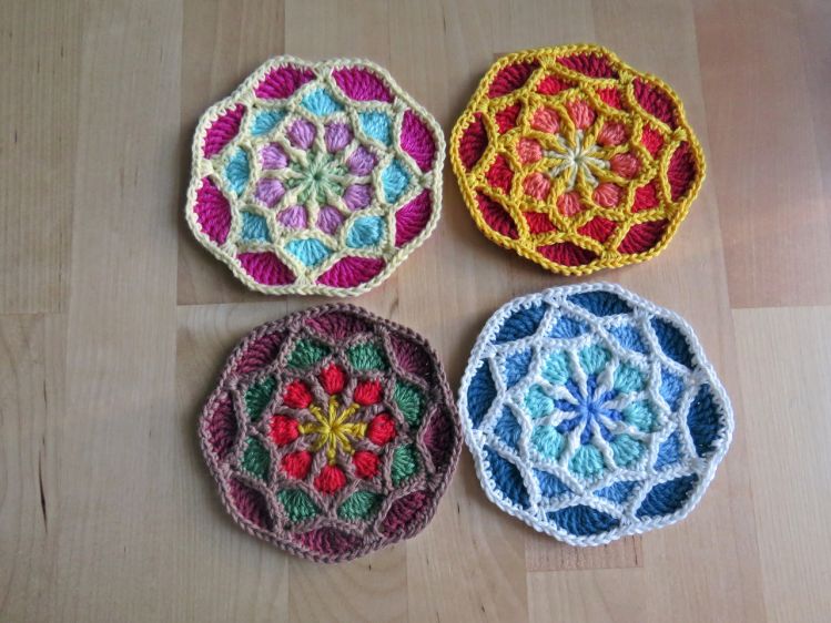 Kleine Mandalas als Glasuntersetzer. Mit meiner Anleitung ganz schnell nachgehäkelt. Ich zeige dir 4 Varianten, die an verschiedene Jahreszeiten erinnern.