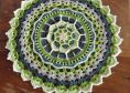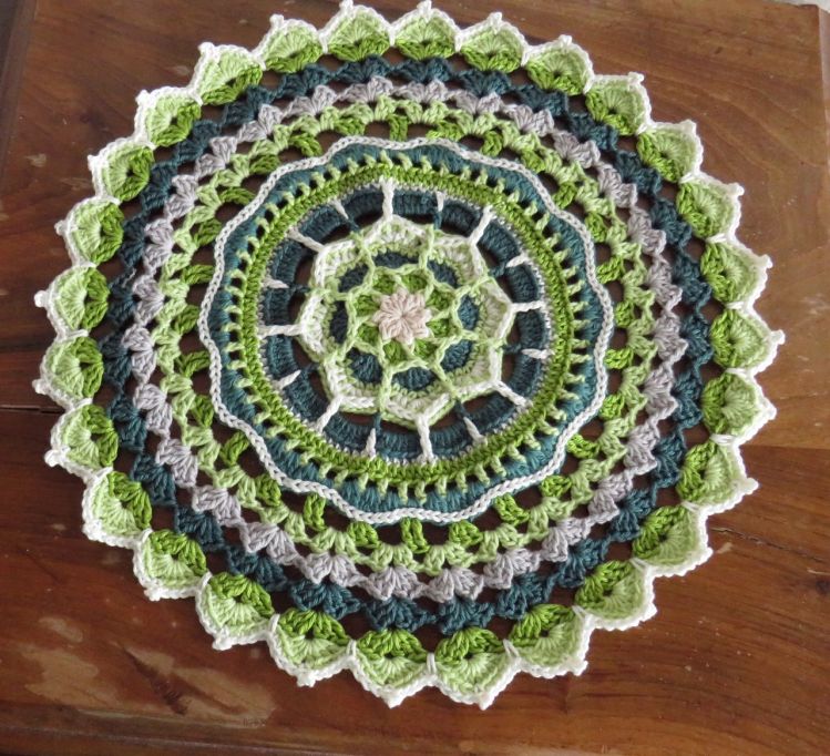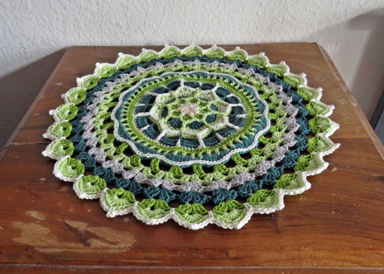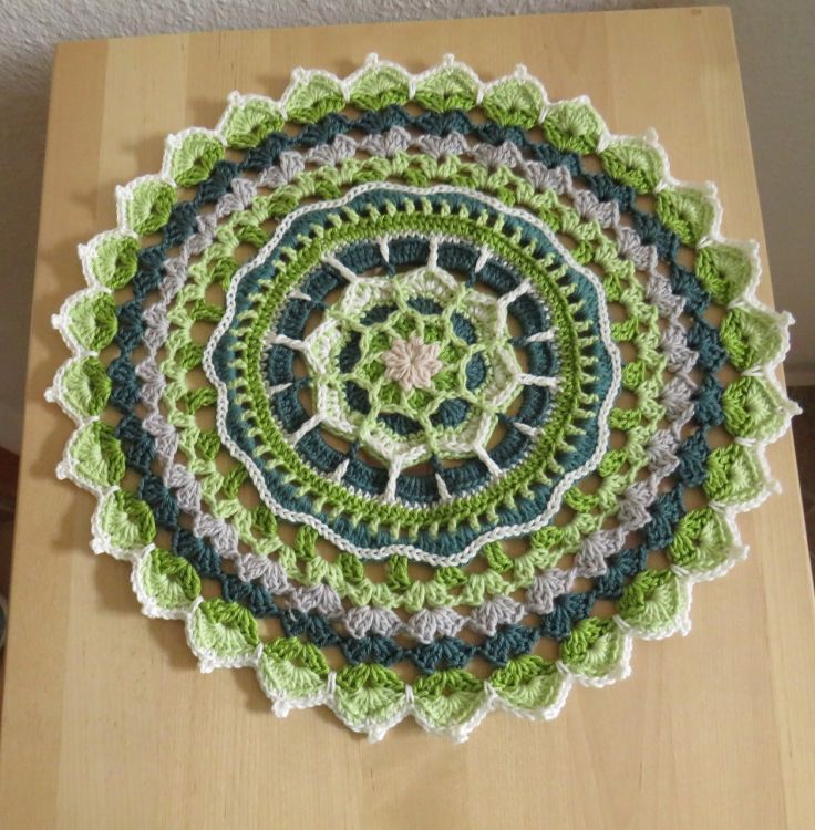 Ein neues, sehr großes Mandala ist entstanden. Ich habe es Laras Dream genannt. Es ist 30 cm im Durchmesser groß und wird aus dünnem Baumwollgarn gearbeitet. Hier in verschiedenen Grün- Tönen.