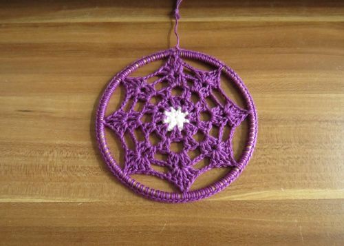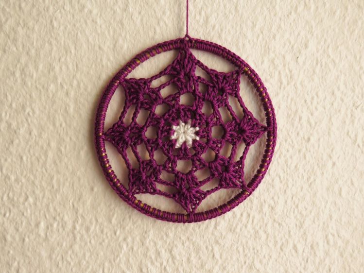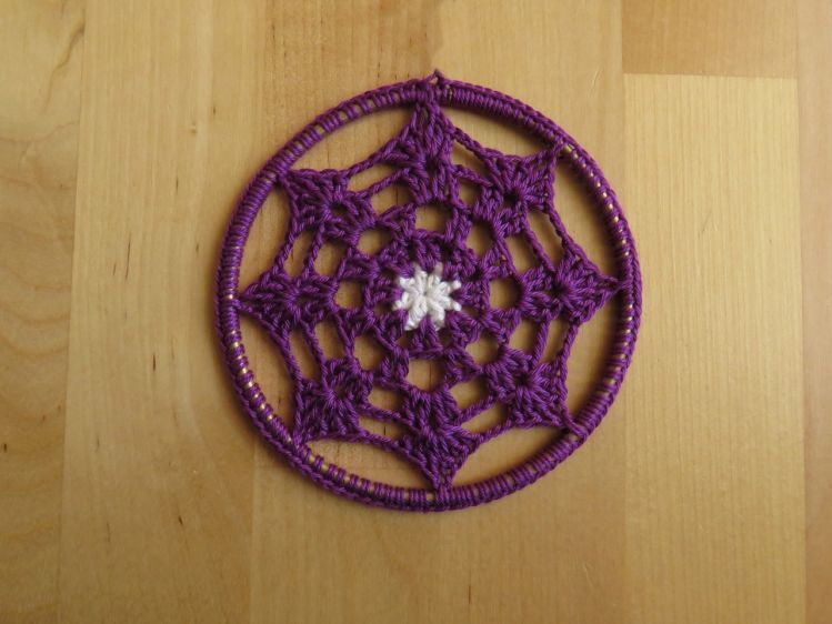 Das Mandala Magic Violet ist das 7 und vorläufig letzte Mandala aus der Serie der Chakra Mandalas. Es ist wie alle anderen 10 cm groß und sitzt in einem Metallring.
