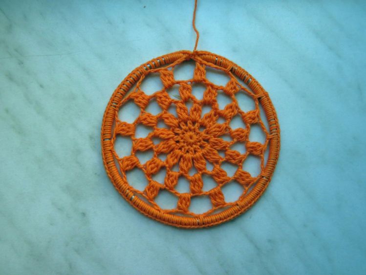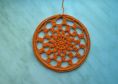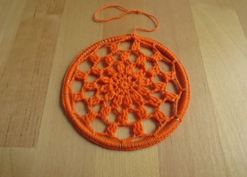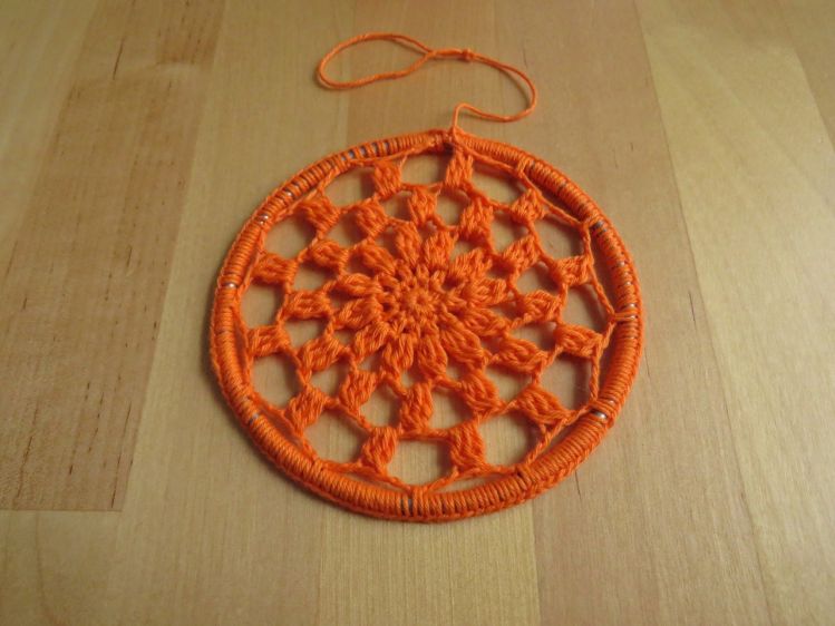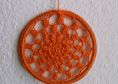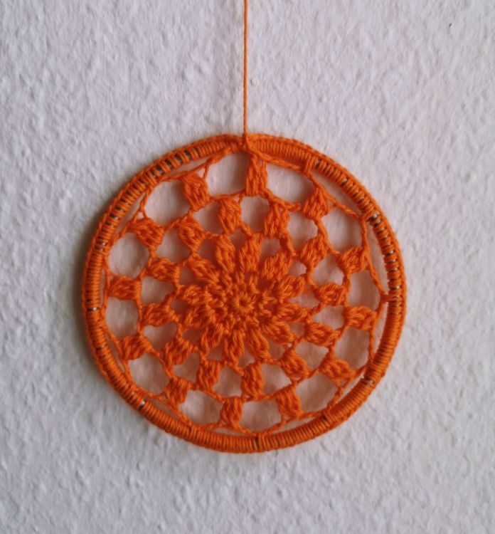 Eine weitere kleine Dekoration ist das Mandala Orange. Es sitzt in einem Metallring mit dem Durchmesser 10 cm. Mit dünnem Baumwollgarn und der Häkelnadel 2,5 ist es in 6 Runden fertig gehäkelt. Ein schnelles Projekt und ebenso ein ideales spontanes Geschenk. Meine Anleitung ist ohne Abkürzungen geschrieben und begleitet dich Schritt für Schritt und mit vielen Detailbildern von der ersten Masche bis zum fertigen Objekt. Viel Freude beim Nacharbeiten