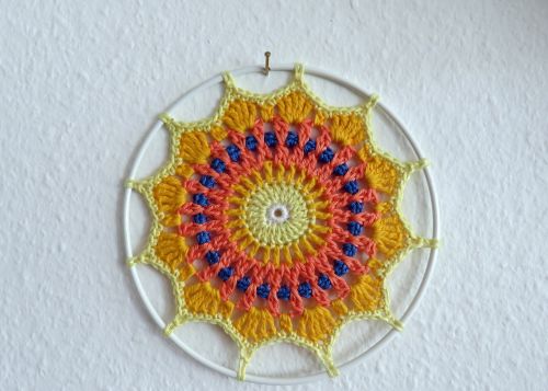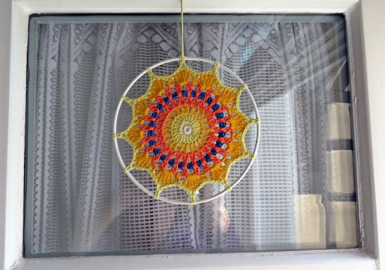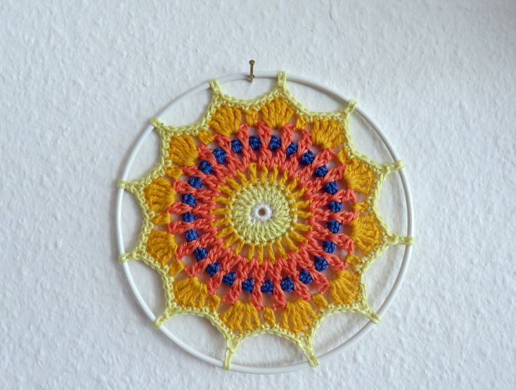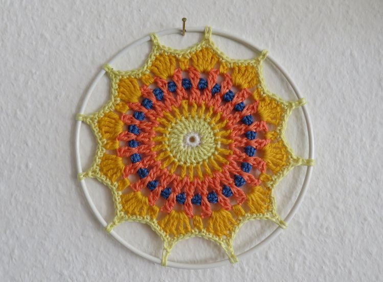 Hier eine kleine Deko für den Garten, das Fenster oder den Spiegel. Mein Mandala Sonnenrad macht Lust auf Sommertage.