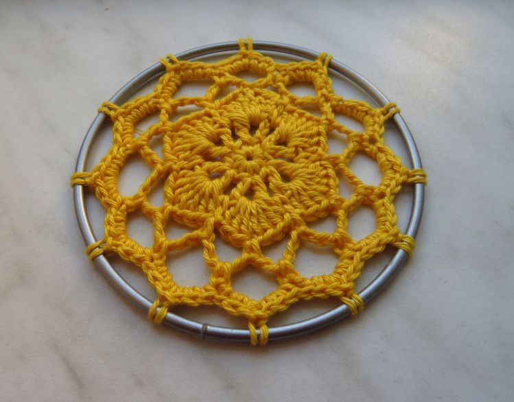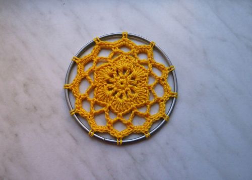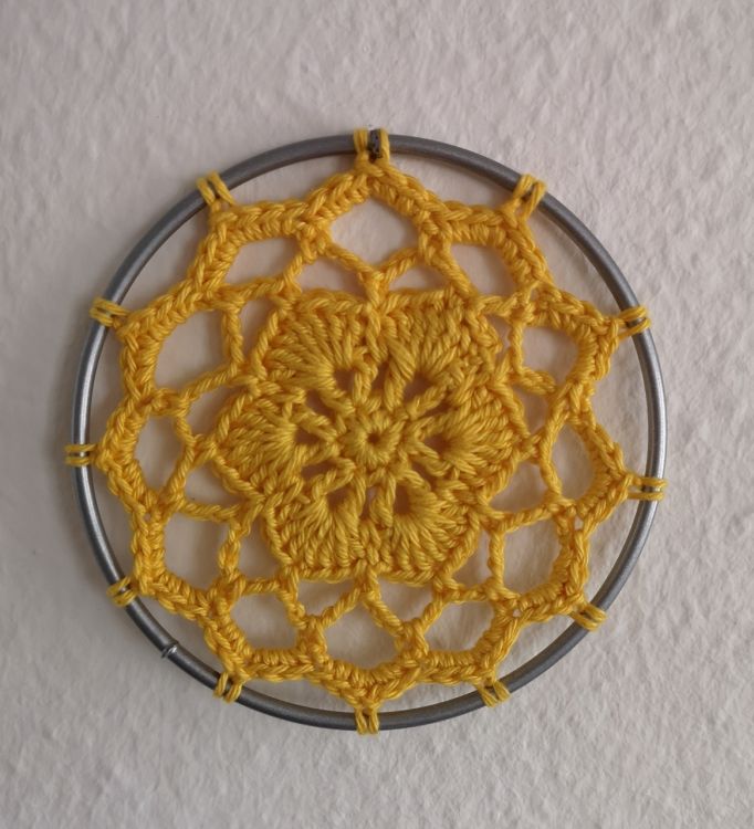 Gehäkelt in 6 Runden in einen Metallring, 10 cm groß.