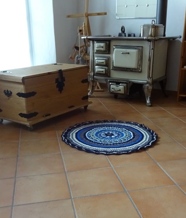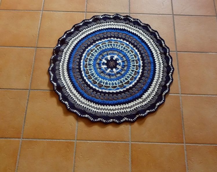 Der Teppich hat dann wie beschrieben einen Durchmesser von 85 cm. Falls du anderes Garn verwendest und eine andere Häkelnadel, ändern sich evtl die Masse.
