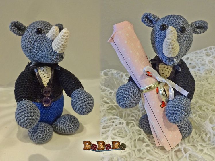 das Nashorn kann auch ein kleines Geschenk zischen den Armen festhalten.