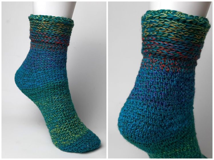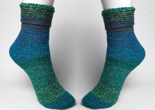 Die Häkelsocke Fixe-Ferse ist sehr schnell gehäkelt und hat einen perfekten Sitz,. Durch die besonderen erweiterten festen Maschen sitzt sie nicht so steif wie man es von Häkelsocken gewohnt ist, sondern sie schmiegt sich schön dem Fuß an und lässt sich dehnen. Auch ist sie nicht so dick wie andere Häkelsocken.