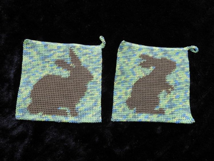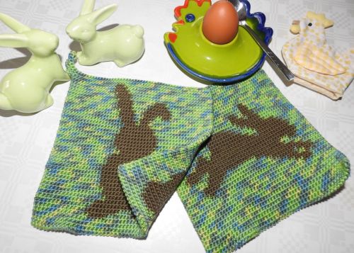 Easter and spring are coming: Potholder in doubleface technique with four different bunny silhouettes. With this technique, you can combine the motifs as you like.