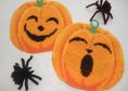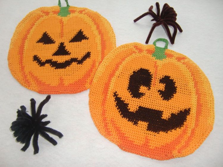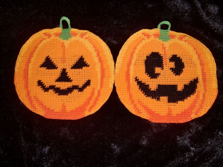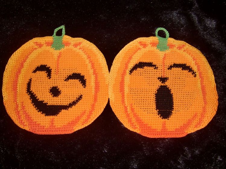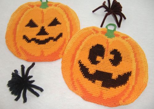 These potholders are just the thing for Halloween! This pair of potholders features pumpkins with facial expressions ranging from funny to scary.