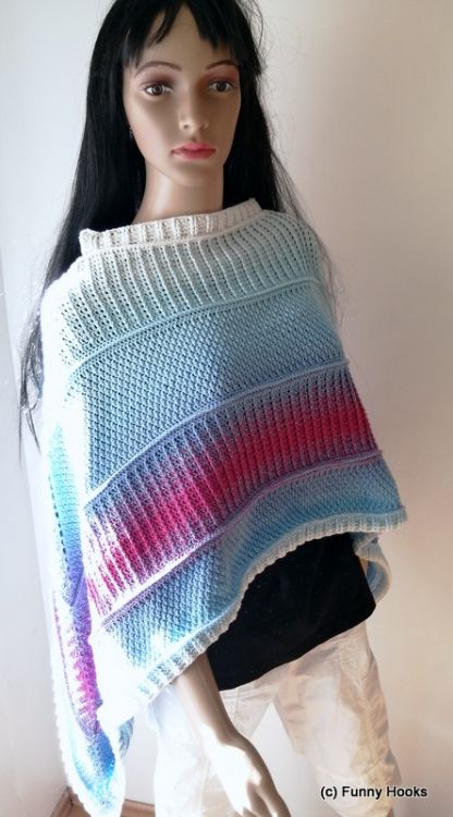 Der Dobas im Titelbild wurde aus einem 2500 m langen und 4-fädigen Funny Hooks Bobbel "Cinny" mit einer NS 3,5 mm gearbeitet und entspricht Kleidergröße M