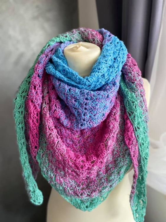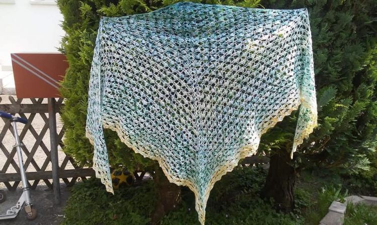 Dieses Tuch ist ein absolut anfängertaugliches Tuch, da es nur aus Luftmaschen, Stäbchen und festen Maschen besteht. Es ist ein recht luftiges Muster, was sehr gut für laue Sommerabende zum Einkuscheln geeignet ist. Je lockerer du häkelst, desto luftiger und größer wird das Tuch! So haben meine Tester von 170x75 cm bis zu 305x110ccm viele verschiedene Größen erreicht.