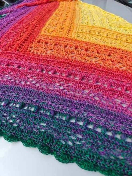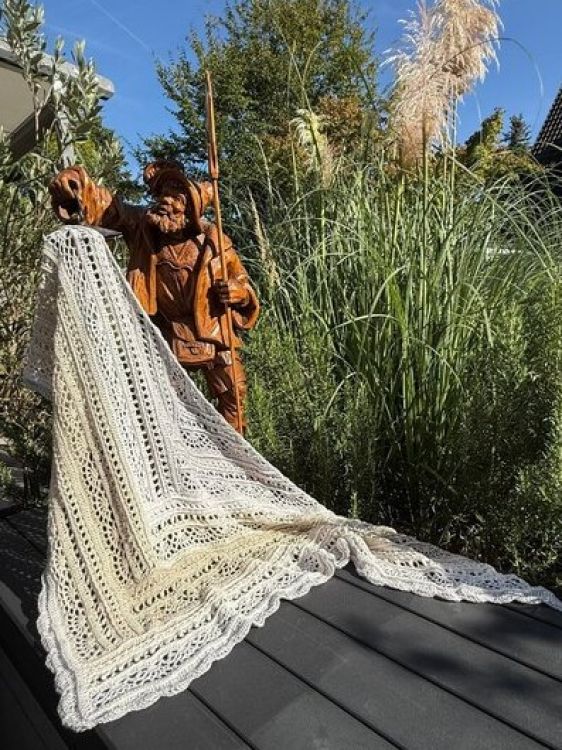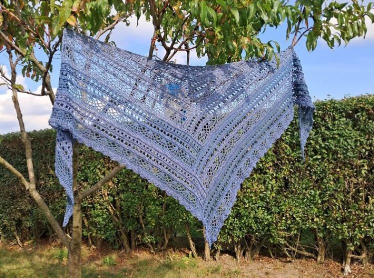 Das Tuch kann in jeder beliebigen Größe gehäkelt werden, da sich die Reihen wiederholen. Bitte beachte, wenn du eine andere Wolle verwendest, eine andere Nadelstärke, oder generelle lockerer/fester häkelst, kann die Größe variieren.
