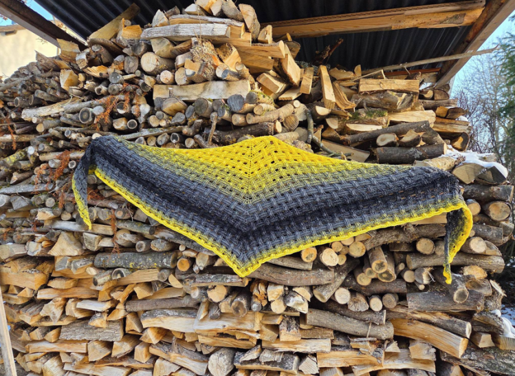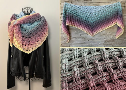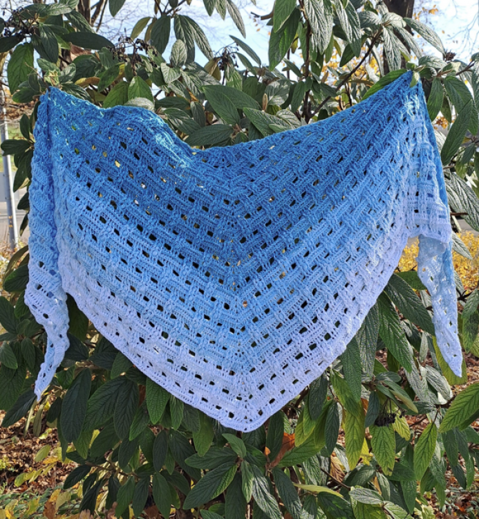 The enchanting shawl Diopatra is a flat shawl with a beautiful braided pattern. Loose and airy, playful with tufted stitches, crochetable in any size—a companion for every season!