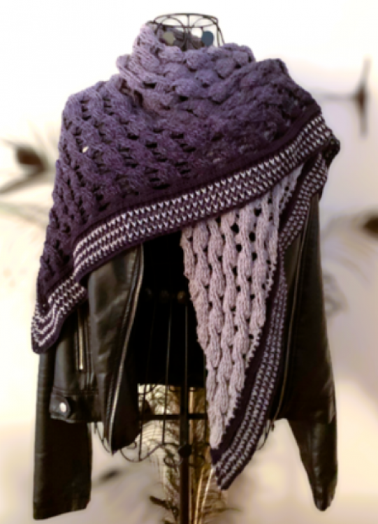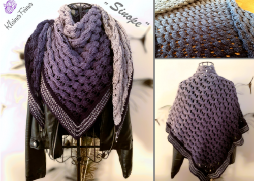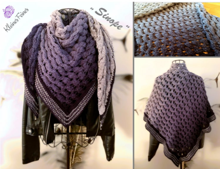 "Sinope" ist ein wundervoll elegantes Dreieckstuch, das asymmetrisch gearbeitet wird. Es besteht aus vielen kleinen Zöpfen, mit Luftmaschen dazwischen, damit es nicht zu dicht ist. Der Rand kann einfarbig oder mehrfarbig gearbeitet werden, die Anleitung enthält genaue Informationen über die Mengen, die für einen mehrfarbigen Rand benötigt werden.