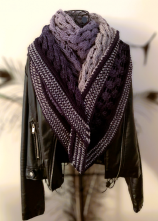 "Sinope" is a beautiful asymmetric triangular scarf, that can be crocheted in any desired size, as the rows repeat. The pattern consists of numerous braids, with loose chain stitch parts in between so that the scarf is cozy but not too thick.