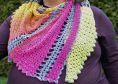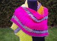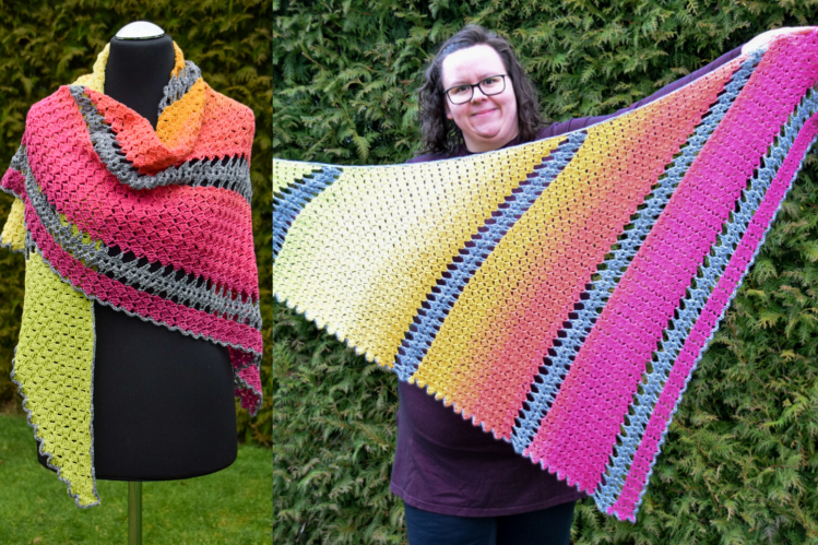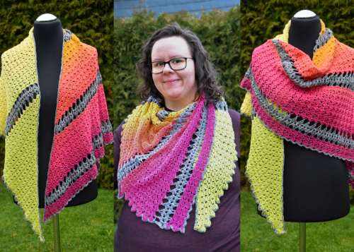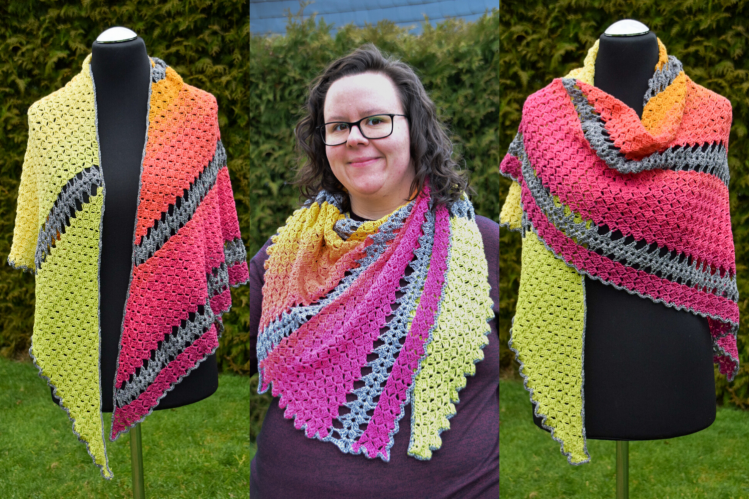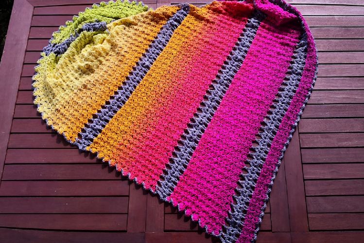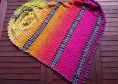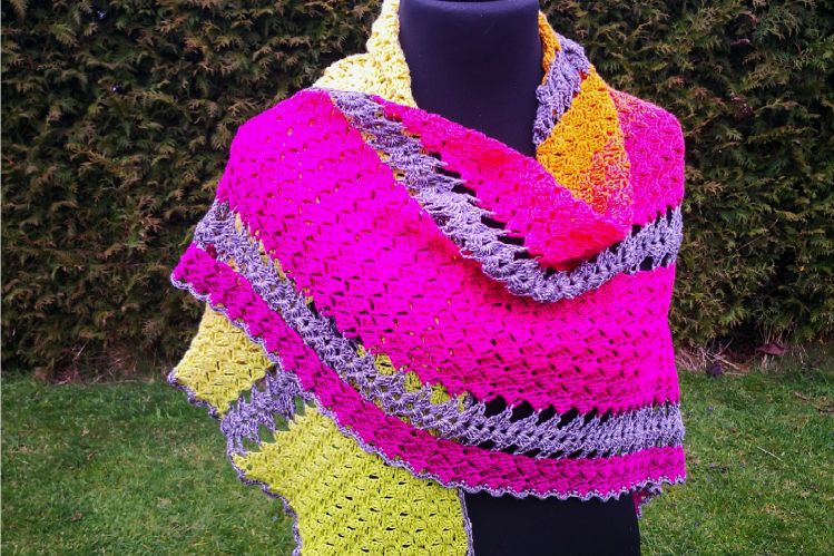 Das Tuch wird grundsätzlich seitwärts gehäkelt. Das Besondere sind hierbei die quer zur eigentlichen Richtung angehäkelten Querstreifen in Kontrastfarbe. Diese werden in bestimmten Abständen gesetzt. Die Abstände können bei Bedarf aber geändert werden, da sind der Fantasie keine Grenzen gesetzt. Hierbei muss natürlich immer bedacht werden, dass sich der Verbrauch ändern kann.