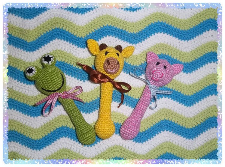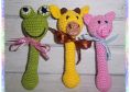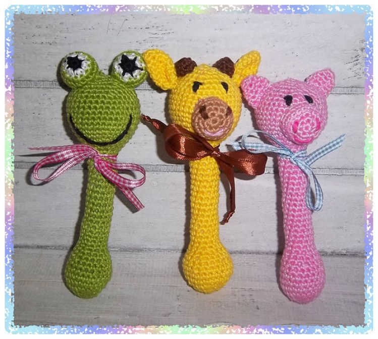 Anleitung für Stabrasseln in Form von Frosch, Schweinchen und Giraffe.