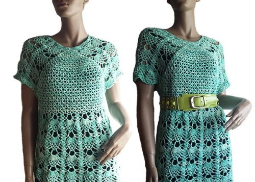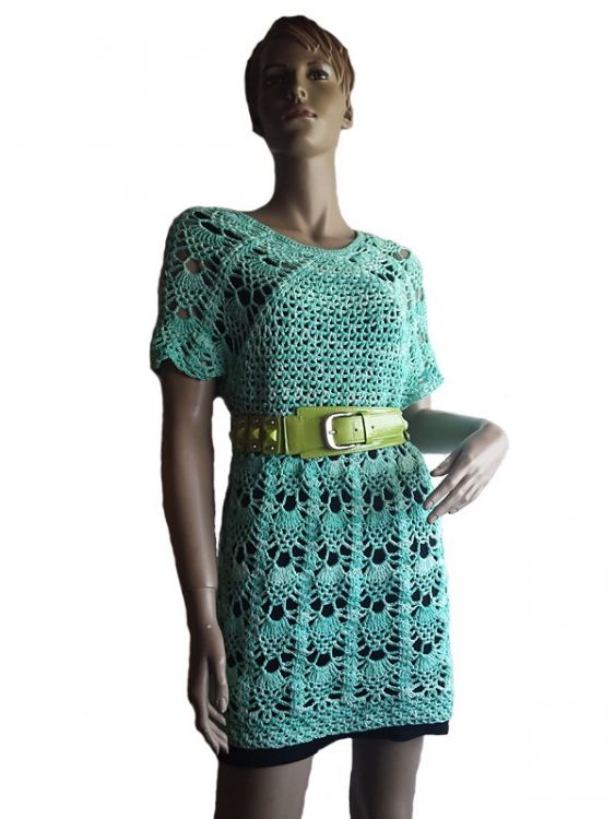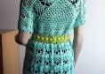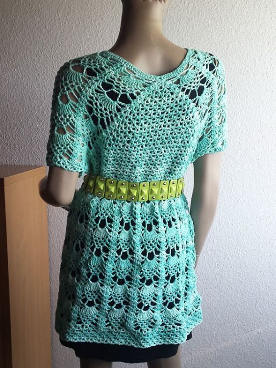 Das Kleid kann in allen gängigen Damengrößen gehäkelt werden da es am Halsausschnitt begonnen wird und dann in Runden nach unten gearbeitet wird. Es kann also so lange zugenommen werden bis der passende Umfang erreicht ist. Ebenso kann die Länge beliebig geändert werden, wenn es lang genun ist einfach den Saum häkeln und die Arbeit beenden. Ich habe ein Baumwollmischgarn für Häkelnadel Nr. 4 verwendet.