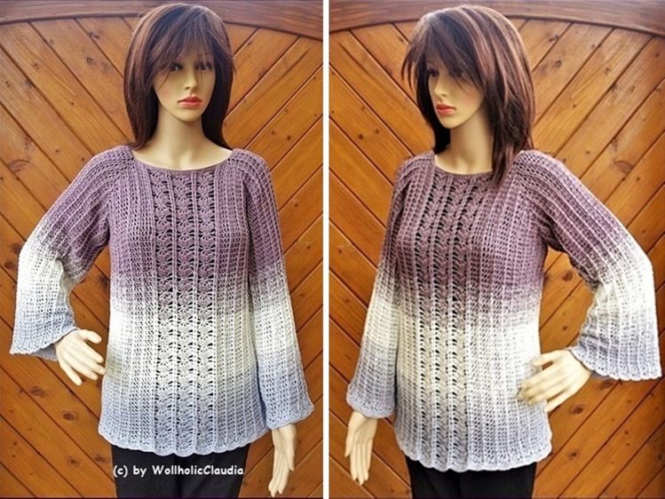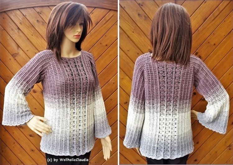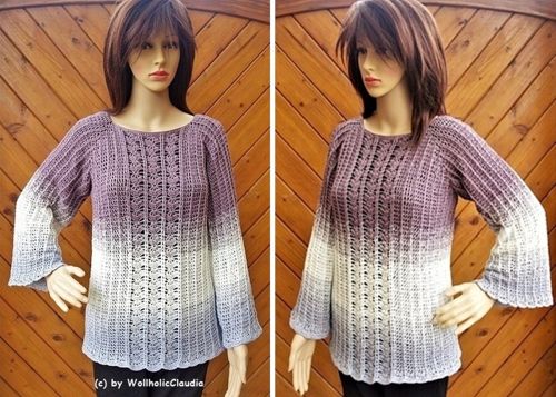 Pullover "Eiskristall" ist für jede Jahreszeit ein toller Begleiter. Das eingefügte Muster vorn und hinten macht ihn zu einem ganz besonderen Blickfang. Der Pulli wird von oben nach unten gearbeitet (Rvo) und ist jeder Damengröße machbar, alles ist genau in der Anleitung erklärt.