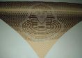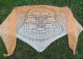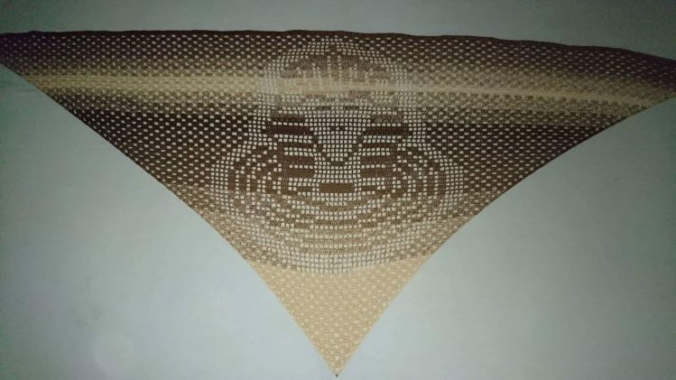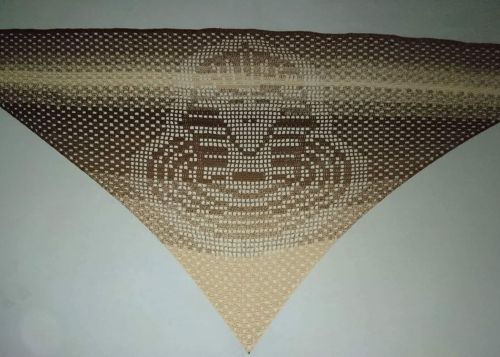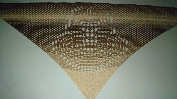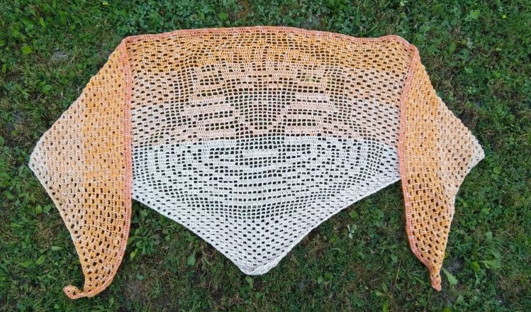 Die Anleitung ist auf 4 Seiten in teilweise Schrift (Erklärung Filethäkeln), der Anfang des Tuches in Häkelschrift und Zählraster geschrieben.