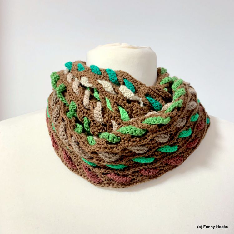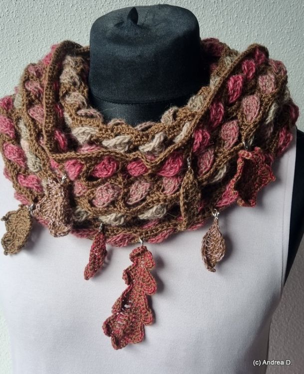 Esenta ist ein raffinierter Loop perfekt für den Herbst. Du kannst Esenta als Loop oder Schals arbeiten und als extra Hingucker auch Blätter in den Farben des Herbst anbringen.