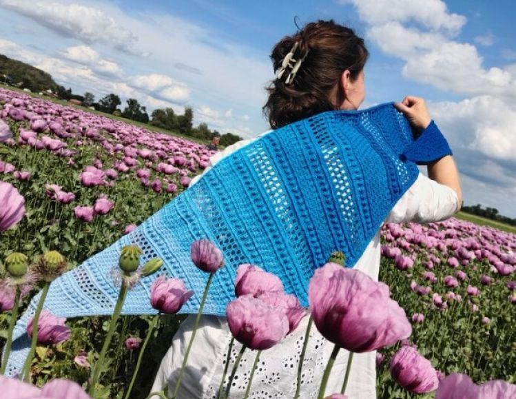Das Tuch Galatea ist ein besonders schmales Tuch, das von einer Seite zur anderen gehäkelt wird. Die Muster sind eingängig, ein perfektes Tuch, um es Abends neben der Lieblingsserie zu häkeln. Es kann in jeder beliebigen Größe gehäkelt werden, da sich die Reihen wiederholen.