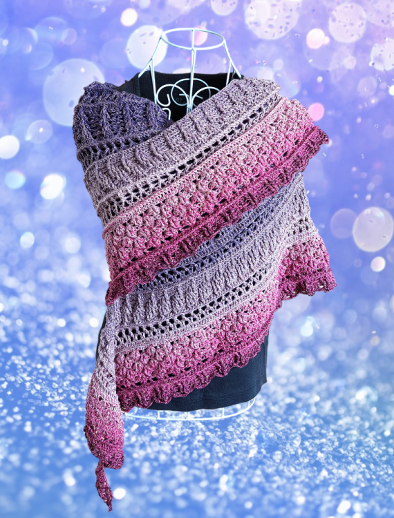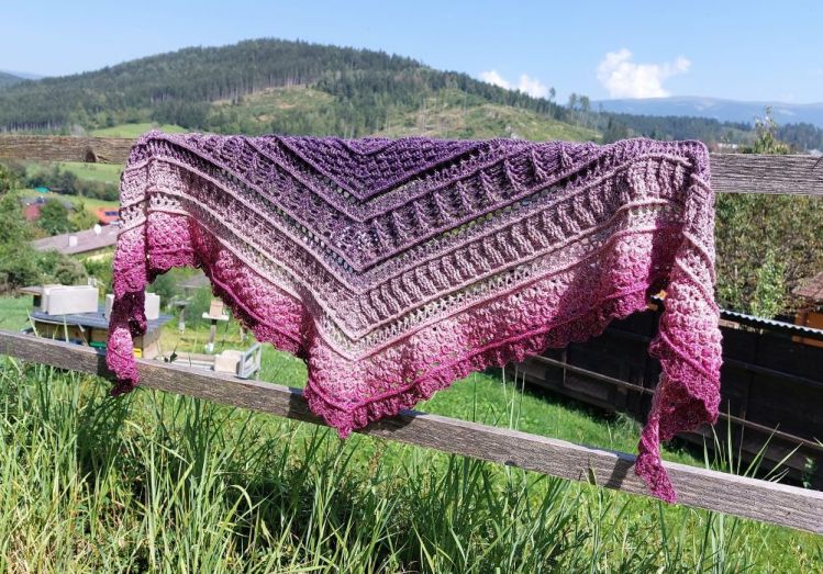 Die wunderschöne Abschluss-Spitze vollendet das Tuch. Es sind auch Ideen entstanden, die Spitzen durch Fransen in ein „Dirndltuch mit Fransen“ zu verändern, ebenso ein Abschluss mit goldenen „Perlen“ wurde gefunden. Diese werden einfach an den Spitzen der letzten Reihe mit eingehäkelt. Alles in allem also ein wunderbares Tuch, das vielfältig verändert und genutzt werden kann.