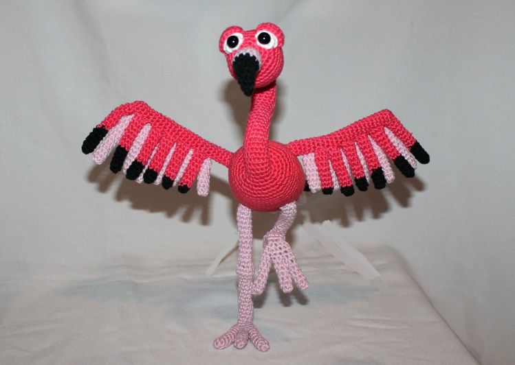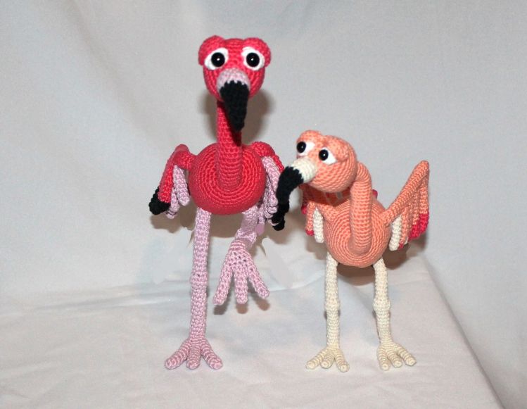 Für den großen Flamingo habe ich Schachenmayr Catania und die 2,5 er Nadel genutzt, für den kleinen Schachenmayr Baby Smiles und die 2er Nadel. Gehäkelt werden Sie genau gleich.