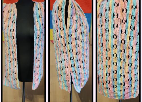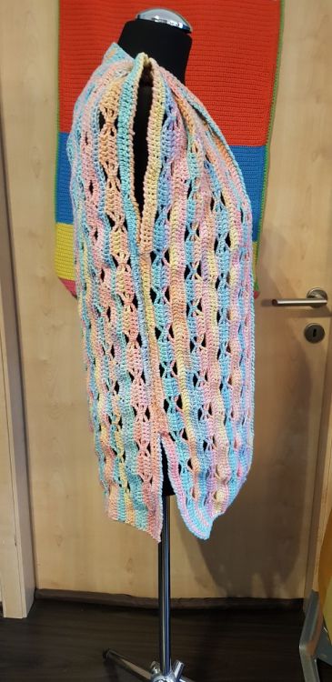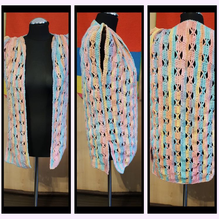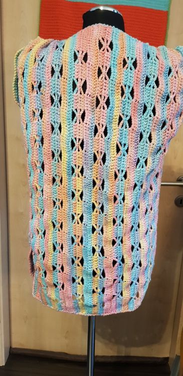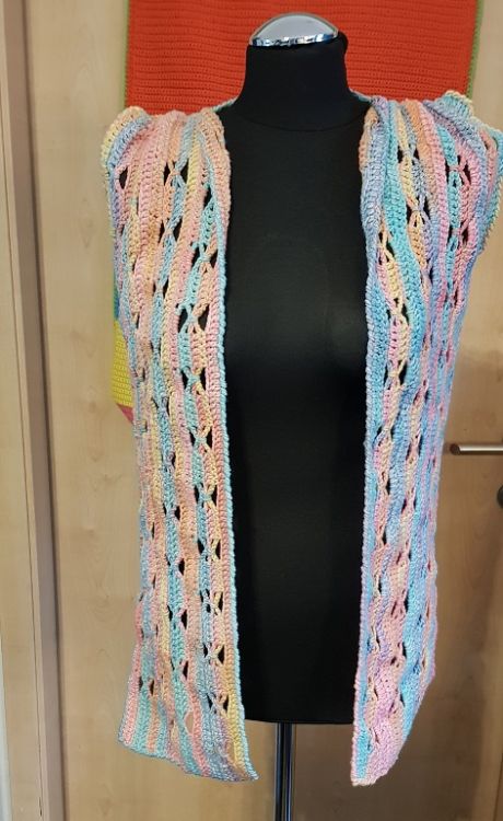 ein farbenfrohes, luftiges Gilet, die so richtig Lust auf Spaziergänge im Freien macht. Luftig leicht, pfiffig im Schnitt schmeichelt es jeder Figur.