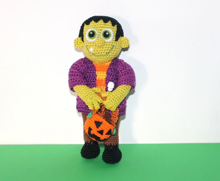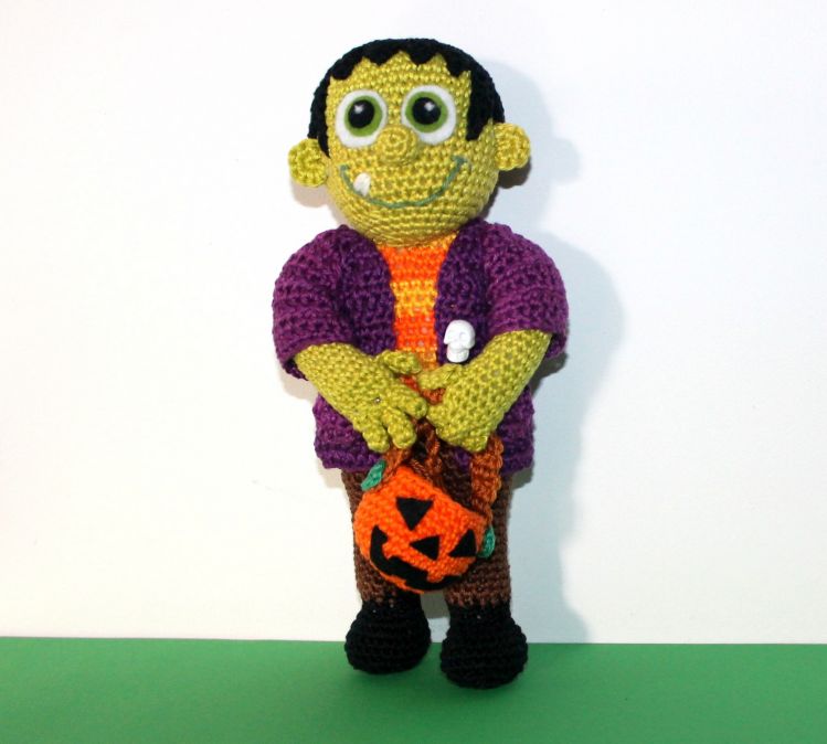Frankenstein Junior has already grabbed his basket and is waiting to play trick or treat on Halloween. That's his absolute favorite day of the year. He does not have to hide and everyone is happy about his great costume.