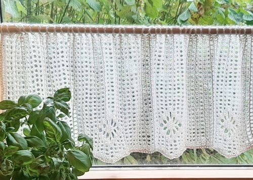 Diese süße Gardine "Blickfang" wird quer gehäkelt. So könnt Ihr ganz leicht Eure gewünschte Fensterbreite anpassen. Auch die Höhe der Gardine ist leicht anzupassen. Dezente Blumen machen die Gardine zum Blickfang von Deinem Fenster. Die Schritt für Schritt Häkelanleitung, mit vielen Foto´s, ist gerade für Anfänger sehr hilfreich. Eine Zusätzliche Häkelschrift ergänzt die Anleitung, es ist aber NICHT nötig die Häkelschrift lesen zu können.