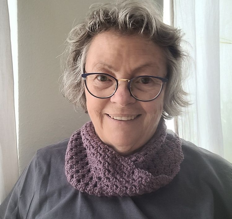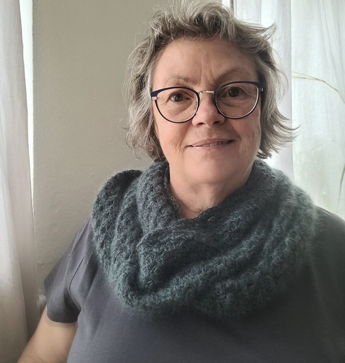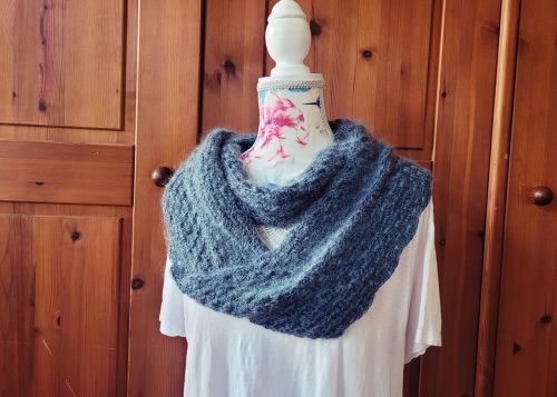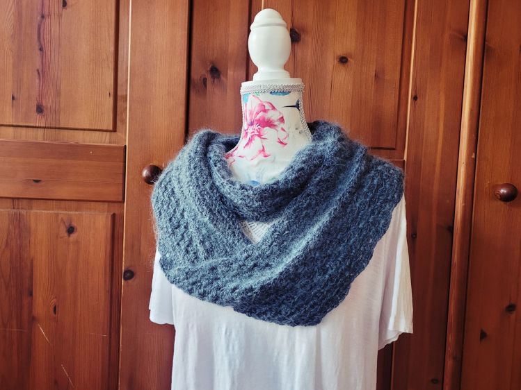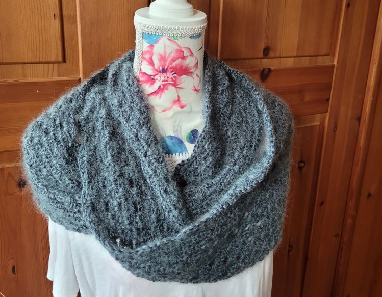 Dieser Loop ist Fluffy, also weich und kuschelig, weil er zweifädig gehäkelt wird. Aus Wolle oder Baumwolle, kombiniert mit einem Faden Mohair Garn. Das Muster besteht aus Gruppen von je 3 Stäbchen, deswegen heißt der Loop auch Granny. Und mit einer Möbius Drehung versehen, kannst du die benötigte Wollmenge viel besser abschätzen, weil du immer nur am äußersten Rand entlang häkelst. Häkle diesen Loop so breit wie du magst und beende ihn mit einer Runde im Muschelmuster.