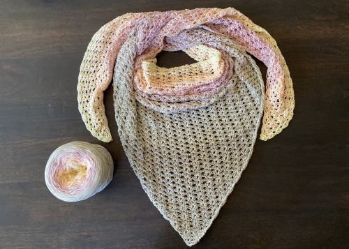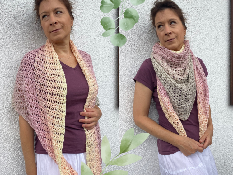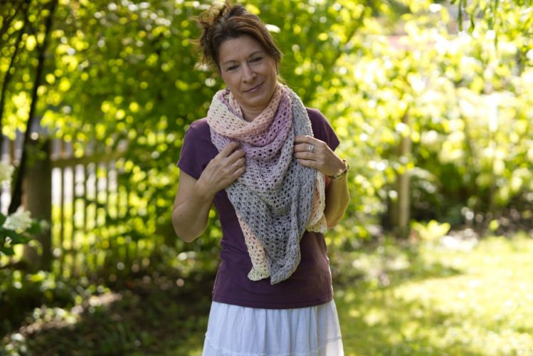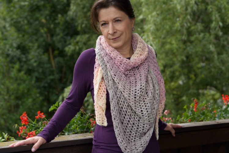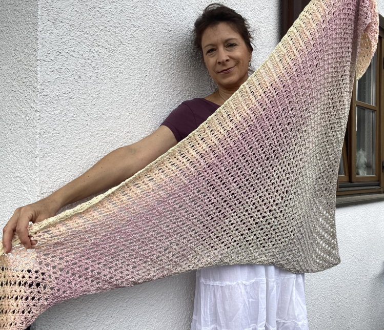 LOLA ist ein wunderschönes luftiges Dreieckstuch, das hier in einem zarten Farbverlauf gehäkelt wurde.