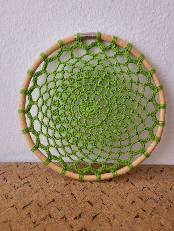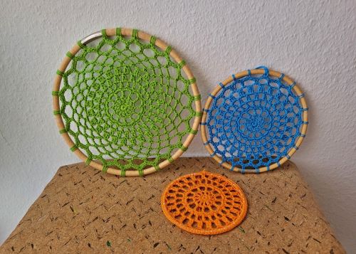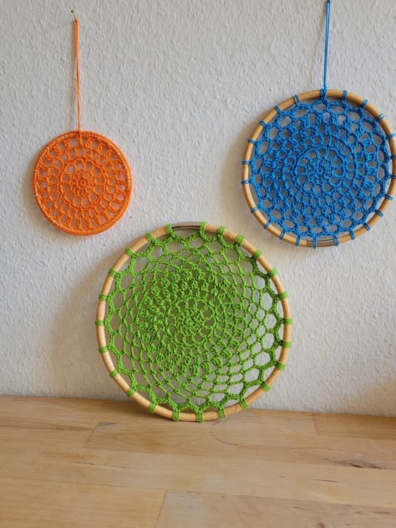 Die „Gute Laune Mandalas“ verzaubern auch im Sommer jeden Platz. Einfarbig gehäkelt und mit verschiedenen Ringen verbunden. Diese drei sind unterschiedlich groß, das Muster baut sich auf von klein nach groß. Wie das geht, kannst du in meiner Anleitung lesen. Du brauchst wenige Garnreste eines dünnen Baumwollgarns und dazu einen Metallring mit dem Durchmesser 10 cm und zwei Bambus Ringe mit den Durchmessern 15 und 20 cm. Dazu die Häkelnadel Nr. 2,5 und schon kannst du loslegen. Meine Anleitung ist wie immer ohne Abkürzungen geschrieben und mit vielen Detailbildern ausgestattet.