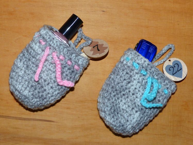 * Bravo Color (Lauflänge 133m/50g), pro Säckchen: Grau ca. 15g und einen Rest für die Kordel in Farbe nach Wahl.