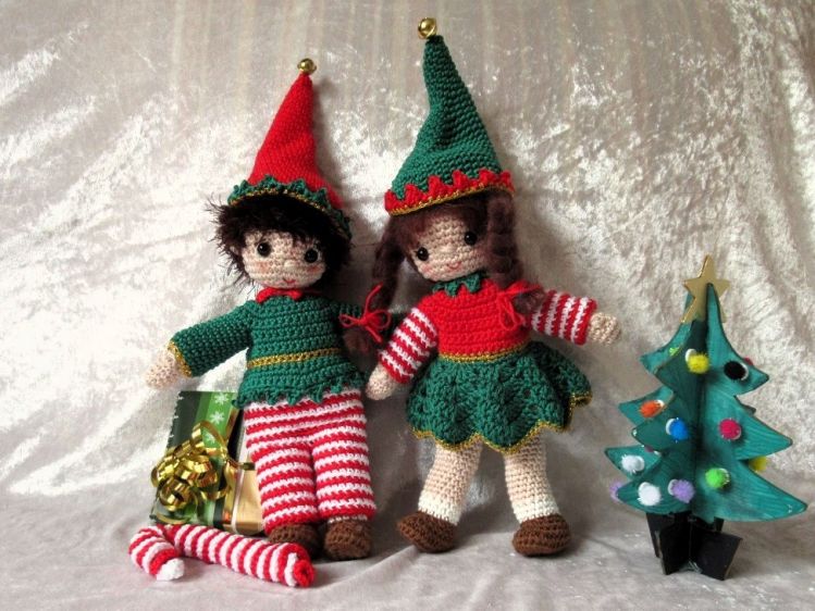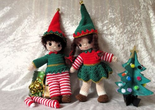 Anna und Anton sind zwei Häkelpüppchen von etwa 20 cm Größe. Heute haben sie ihre Weihnachtelfenkostüme angezogen, um dem Weihnachtmann bei der Arbeit zu helfen. Die Kleidung kann den Puppen an- und ausgezogen werden, so dass sie auch andere Puppenkleidung tragen können.