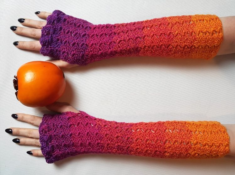 Material: Länge und Armumfang können angepasst werden. Fertige Länge ca. 36cm (von Ellenbogen bis Fingerbegin). Größe S, Armumfang Unterarm 24 cm, gemessen ca. 4cm unter Ellenbogen: 280m/70g (400m/100g) Nadel 3-3,5mm Größe M und größer, Armumfang größer als 24 cm, gemessen ca. 4cm unter Ellenbogen: 400m/100g (400m/100g) 3-3,5 mm Farbverlaufsgarn 4 fädig oder Garn mit der gleichen Stärke.