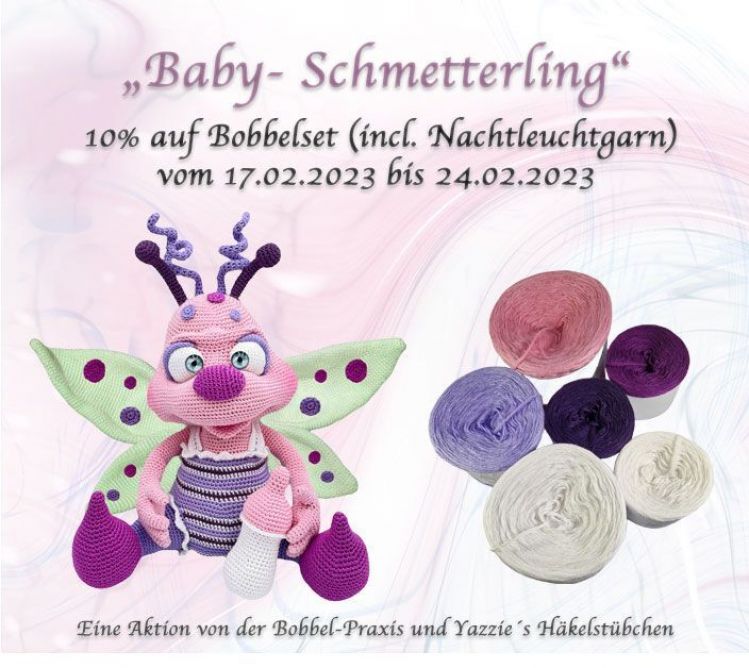 Wenn Ihr gerne mit Bobbeln arbeitet, könnt Ihr das passend gewickelte Paket bei meiner Kooperationspartnerin Steffi Masch in der „Bobbel-Praxis“ bestellen (-nur solange der Vorrat reicht-). Hier ist auch automatisch das passende Nachtleuchtgarn für die Flügel dabei.