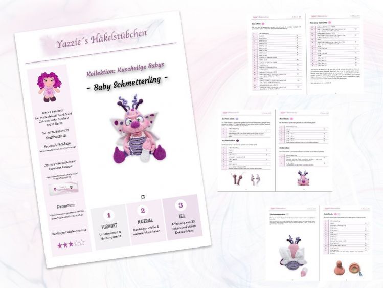 Die deutsche Originalausgabe dieser Anleitung erschien erstmals am Freitag, den 17. Februar 2023 unter dem Titel: „Baby Schmetterling - Kollektion: Kuschelige Babys“. Das Urheberrecht für diese Anleitung liegt bei Yazzie ́s Häkelstübchen - Jessica Behrendt. Dies betrifft sowohl den Text, als auch die Fotos, Illustrationen und Zeichnungen. Verkauf, Vervielfältigung, Tausch und Veröffentlichung (inkl. Übersetzungen) der Anleitung (einschließlich Veröffentlichung im Internet) sind untersagt und stellen eine Urheberrechtsverletzung dar.