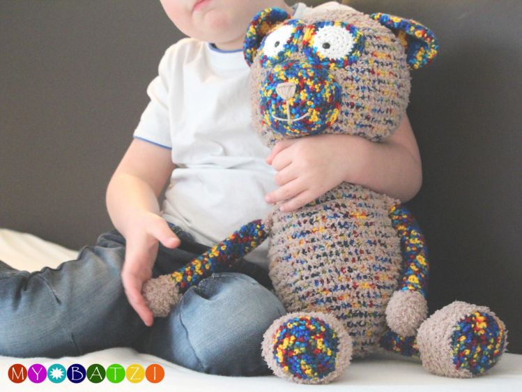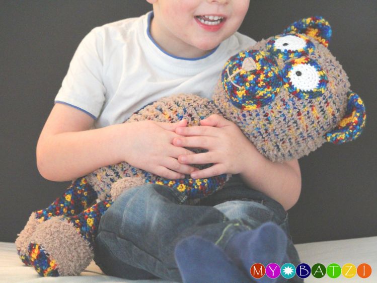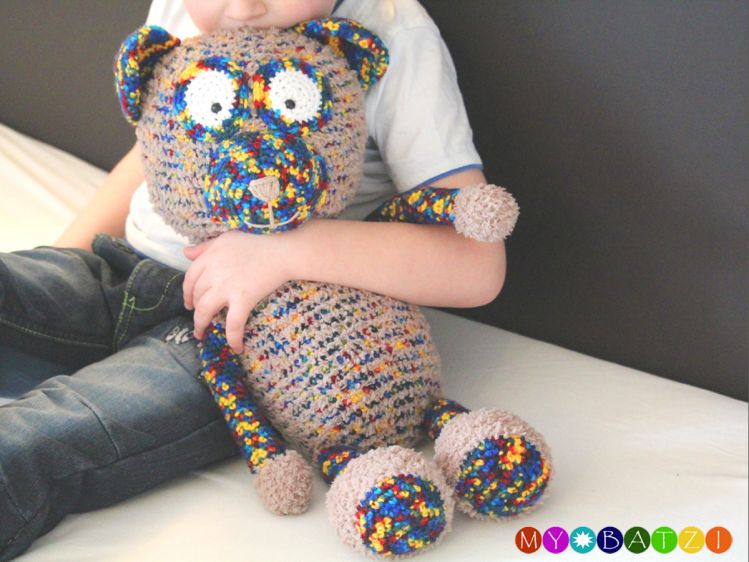 Da der Bär mit einer größeren Garnstärke gehäkelt ist, ist er ebenso schnell gehäkelt, wie ein kleiner Bär.