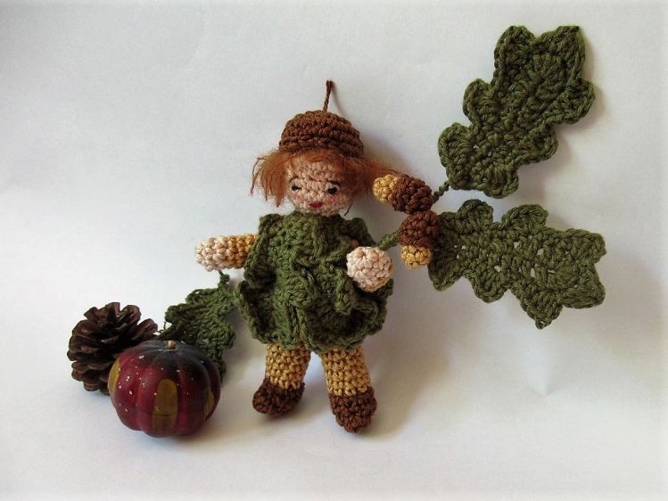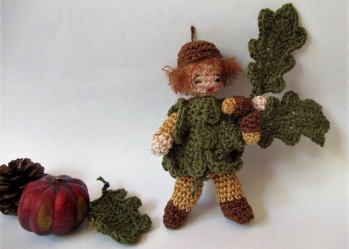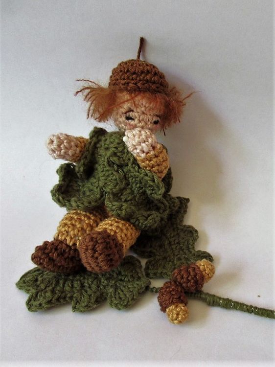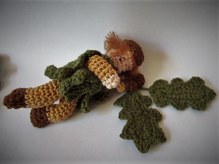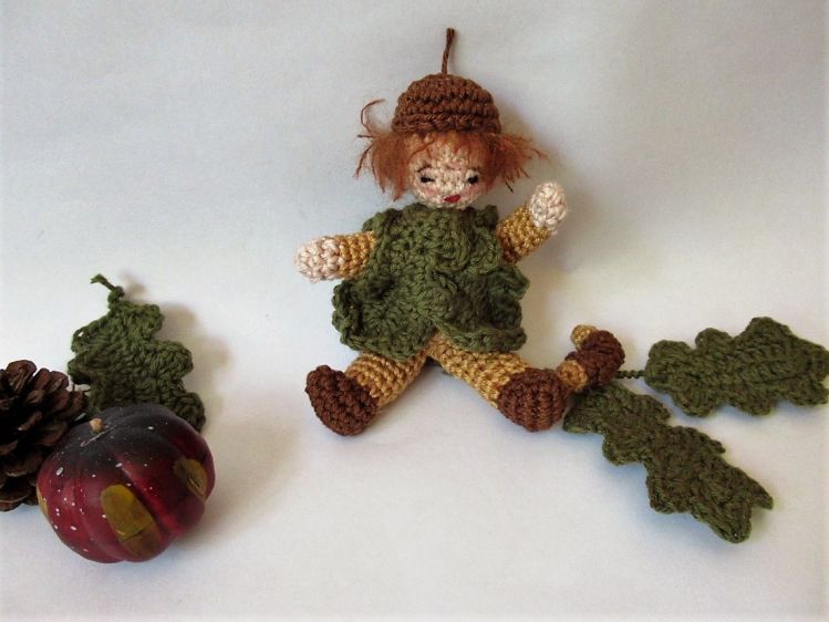 Das Blumenkind Eiche ist eine tolle Herbstdekoration, z. B. für den Jahreszeitentisch. Es ist nur etwa 12 cm groß und hat biegsame Arme und Beine. Es trägt einen Umhang aus Eichenblättern und hat im Arm einen Eichenzweig. Dukannst das Blumenkind aus Wollresten häkeln.
