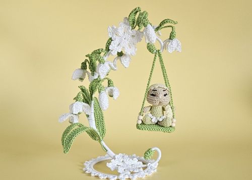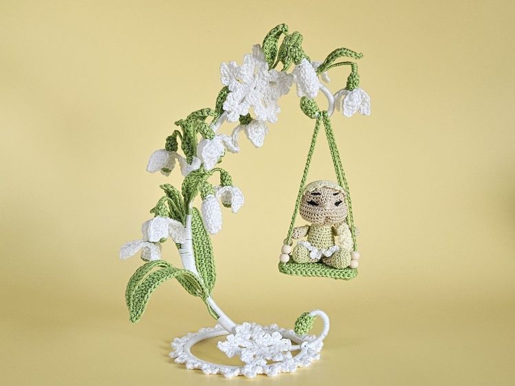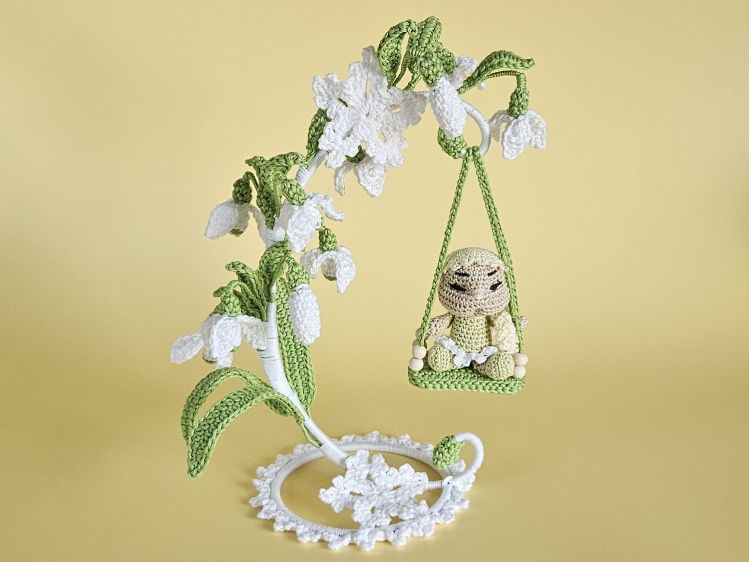 Elva Schneeglöckchen ist ein zartes Blumenkind, das zwischen filigranen Schneeglöckchen auf einer kleinen Schaukel sitzt und den Frühling mitbringt.