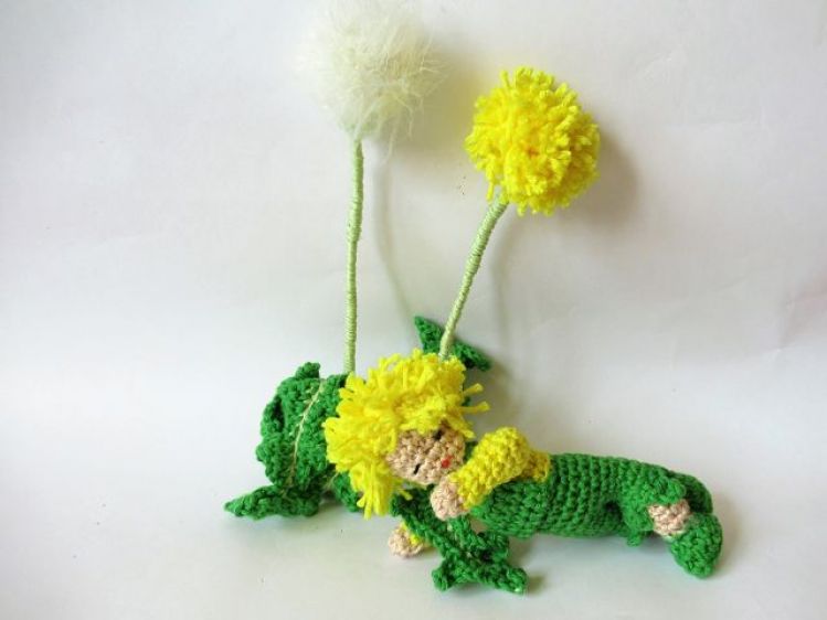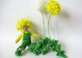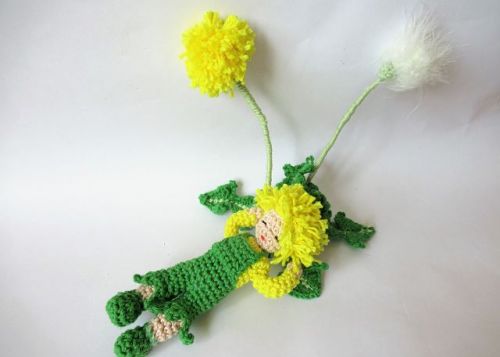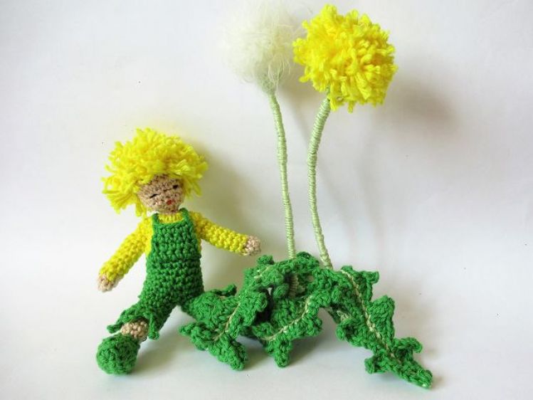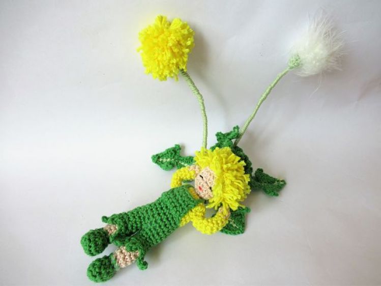 Das Blumenkind Löwenzahn kannst du aus ein paar Wollresten leicht nachhäkeln. Es hat bewegliche Arme und Beine und kann deshalb in verschiedenen Positionen dekoriert werden.