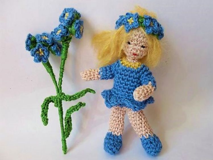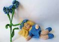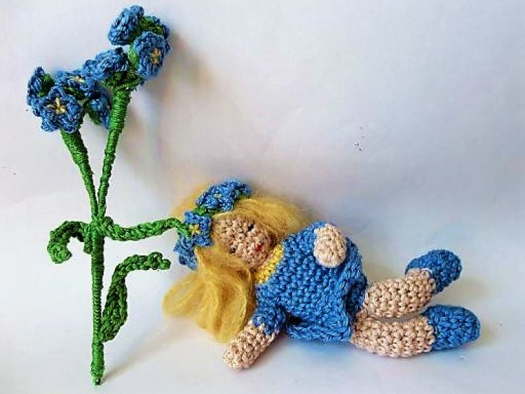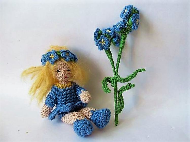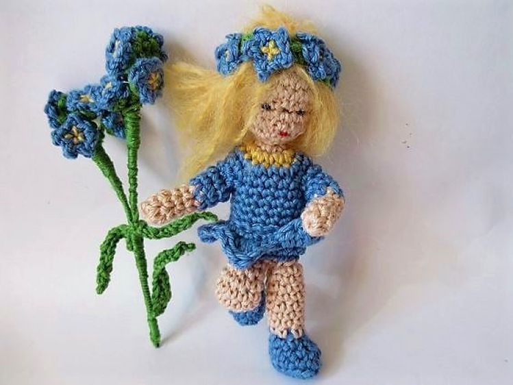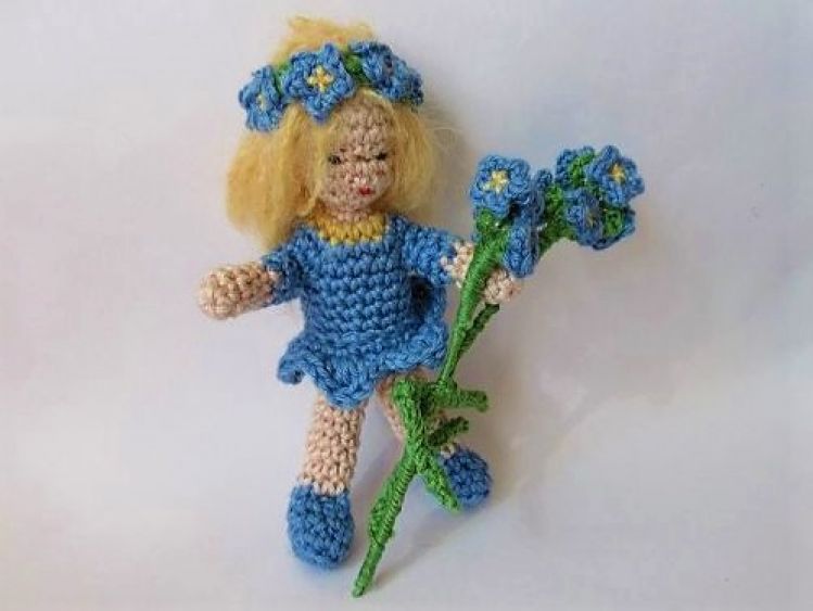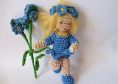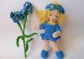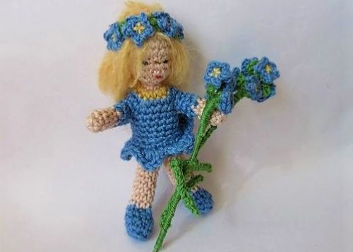 Das Blumenkind Vergissmeinnicht ist eine zierliche kleine Elfe für die Frühlingsdekoration auf dem Jahreszeitentisch. Sie ist etwa 12 cm groß und hat durch Draht verstärkte biegsame Arme und Beine. Du kannst sie aus wenigen Wollresten nachhäkeln.