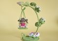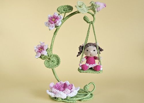 Yareli Seerose ist ein liebevoll gestaltetes Blumenkind, eingebettet in eine dekorative Szene aus Seerosenblättern, Blüten und einer filigranen Schaukel.