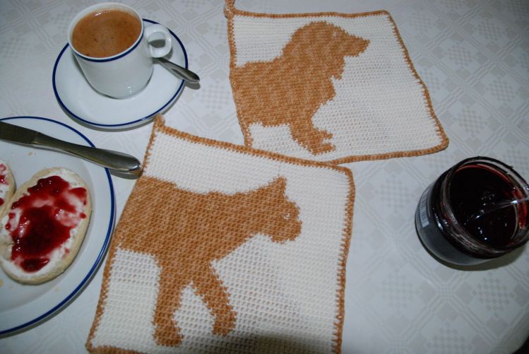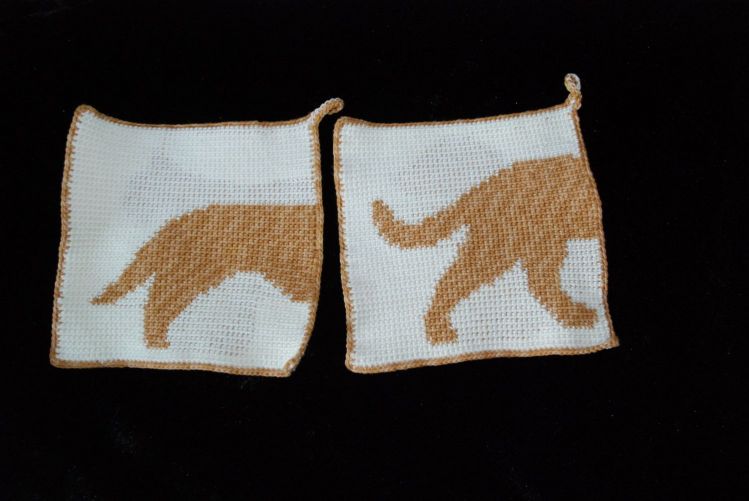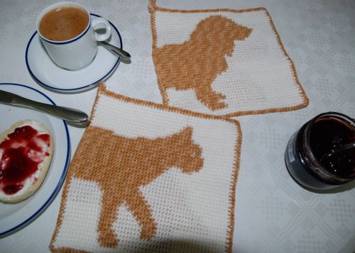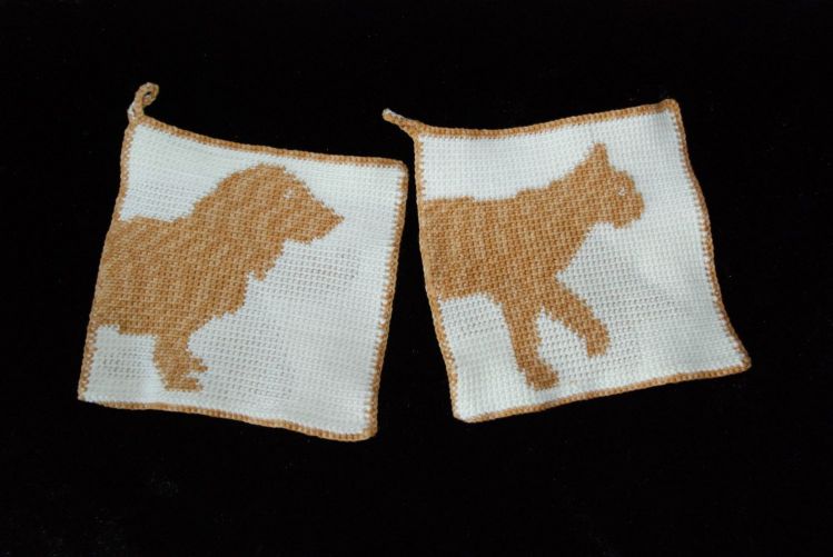 Dog vs. cat. This is often a fundamental question for animal lovers. The potholders crocheted in double face technique are great: you can have different motifs on both sides. The motifs on these potholders are the split silhouettes of a dog and a cat.