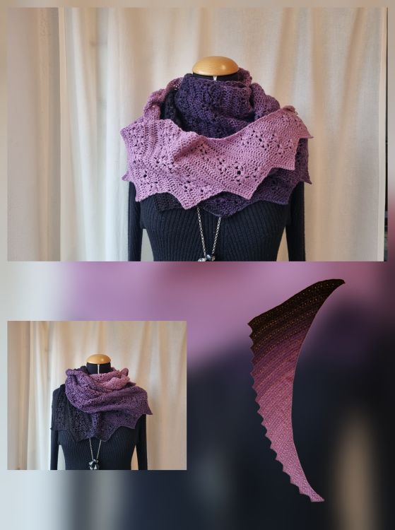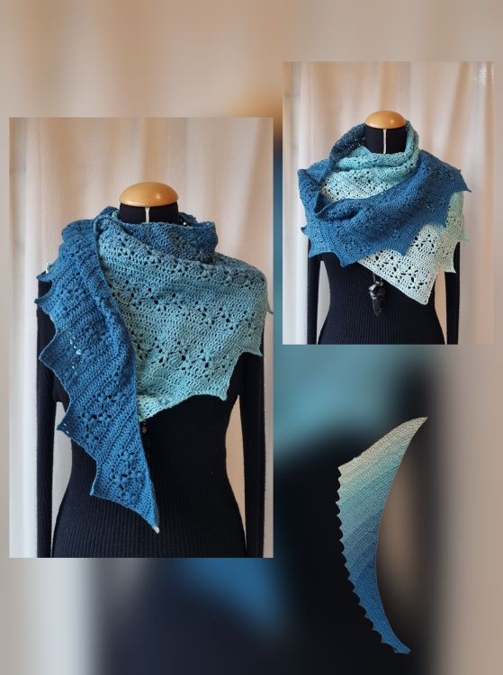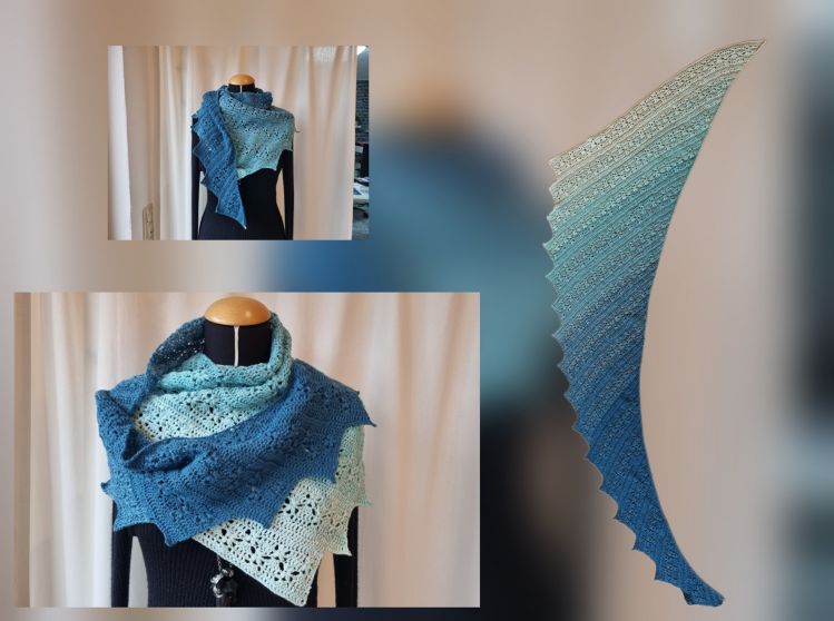 Farbverlaufsgarn 3-fädig, 800m/200g, Nadelstärke 3,0 von DeiDei´s Bobbleplanet ergab einen Drachenschal mit den Maßen 148x64