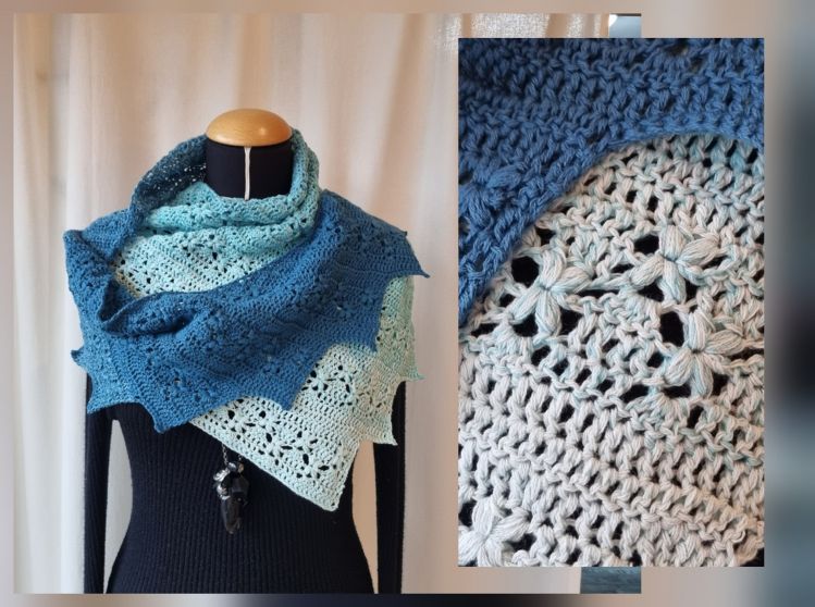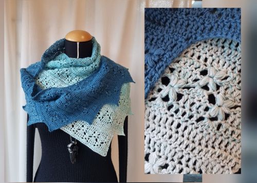 Testgehäkelt mit einem selbstgewickelten, 4-fädigen Bobbel der Testhäklerin mit Nadelstärke 2,5 ergab einen tollen, individuellen Drachenschal mit den Maßen 180x80cm.